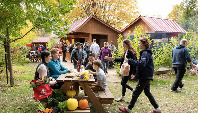 More than 25 producers gather at the Lions Park in wooden kiosks with red roofs.