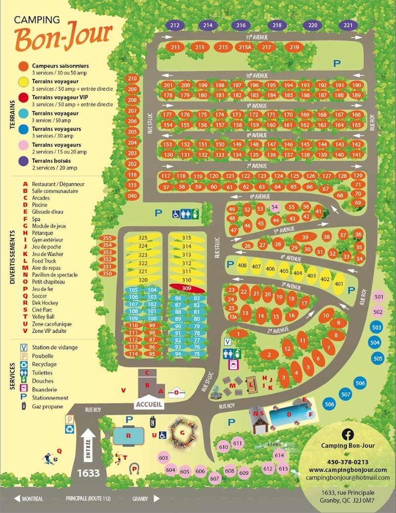 Que vous voyagiez en motorisé ou en tente, le Camping Bon-Jour a tout ce qu’il faut pour rendre votre séjour inoubliable. Nous offrons tous les services pour votre confort, ainsi qu’une foule d’activités sur le site : ciné-parc, piscine, terrains de volleyball, de soccer, de pétanque, jeux de fer, surface de dek hockey, shuffleboard, impressionnant module de jeux pour enfants, arcade et notre zone cacofunique. À proximité, découvrez le Zoo de Granby (à 10 minutes), le parc aquatique de Bromont – montagne d’expériences (à 20 minutes), la piste cyclable de Granby (à seulement 2 minutes à vélo), plusieurs golfs et la Route des vins. Au plaisir de vous accueillir !