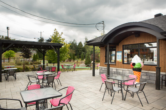 D’inspiration américaine et très différent du traditionnel miniputt par sa thématique et la longueur de ses verts, Minigolf Victo vous séduira par son parcours intégrant une caverne, des ruisseaux, un lac et une île. Une allée est également aménagée sur une montagne d’où coule une chute spectaculaire. Un magnifique aménagement paysager s’intègre au décor afin de compléter son côté grandiose.Minigolf Victo est muni d’un bar laitier avec une terrasse extérieure chauffée pouvant accueillir une soixantaine de personnes assises permettant aux gens de se détendre entre amis, en famille ou en groupe tout en profitant de la superbe vue. Quoi de mieux qu’un petit rafraîchissement après une partie de minigolf !