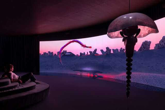 «swell of spæc(i)es» (houle d’espæces) est une installation immersive. Elle plonge le public dans un univers surnaturel composé d’un paysage à la fois cosmique et aquatique, d’un film cyclique, d’un environnement sonore enveloppant, ainsi que de