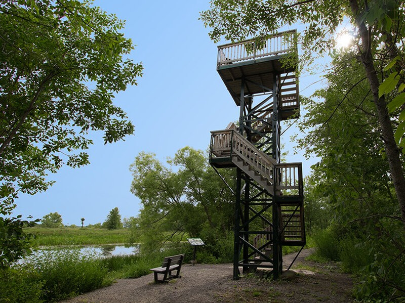 Le sentier linéaire de la baie d’une longueur de 1,3 Km avec sa tour et ses haltes, vous amène au coeur même du plus grand marais aménagé de l’est de l’Amérique du Nord.